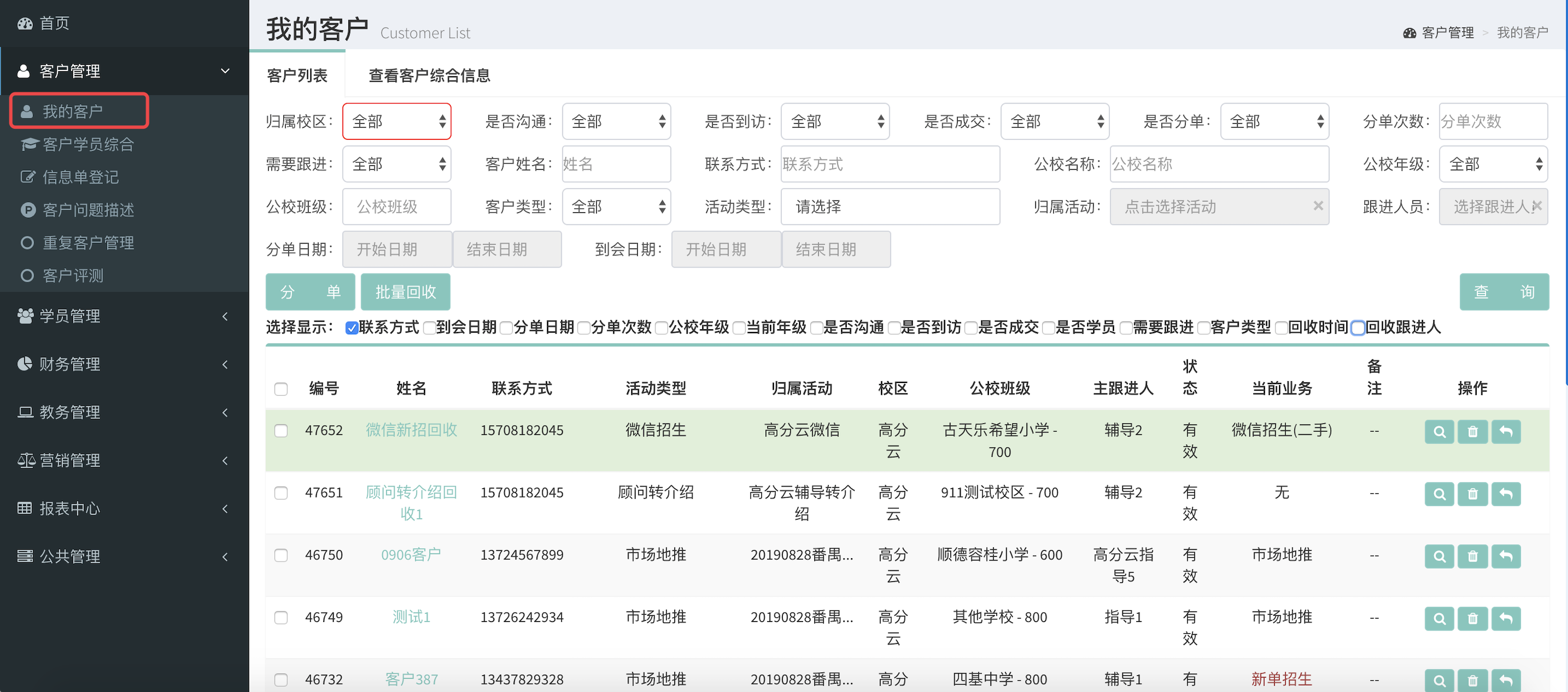 用于管理客户信息(新建、编辑、分单和转学员等)