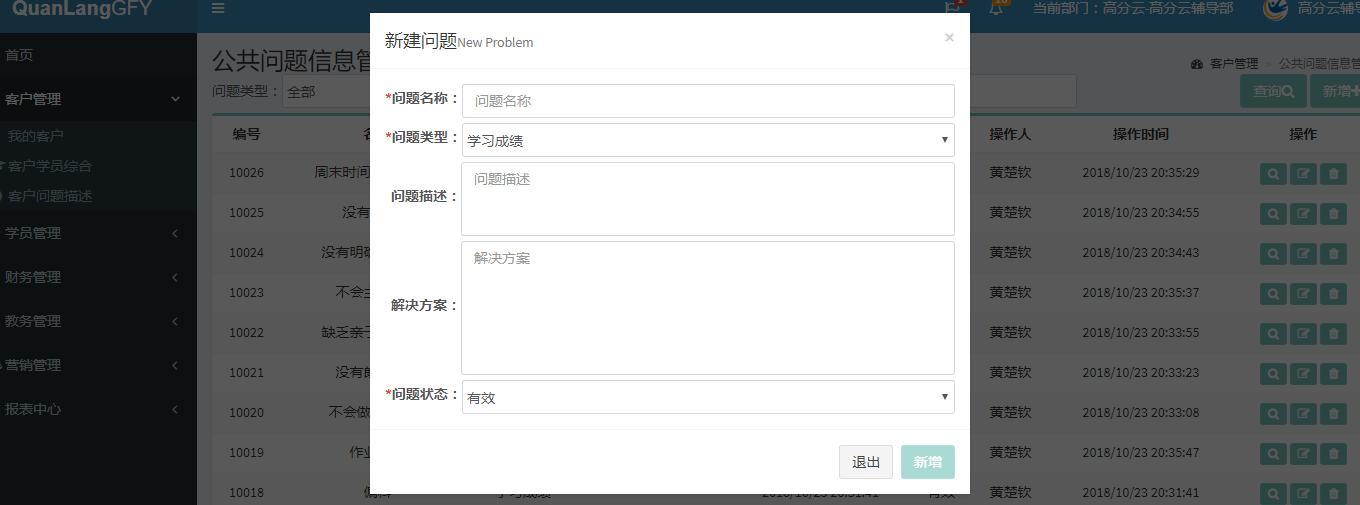 在客户管理-客户问题描述,可以添加客户问题和解决方案,以及查看、编辑和删除等操作。