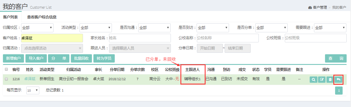 目前对于信息单活动来源的客户,订单状态为未成交的可以进行信息单回收。回收信息单的权限只有主管可以操作。回收后的信息单状态是“未分配主跟进人”