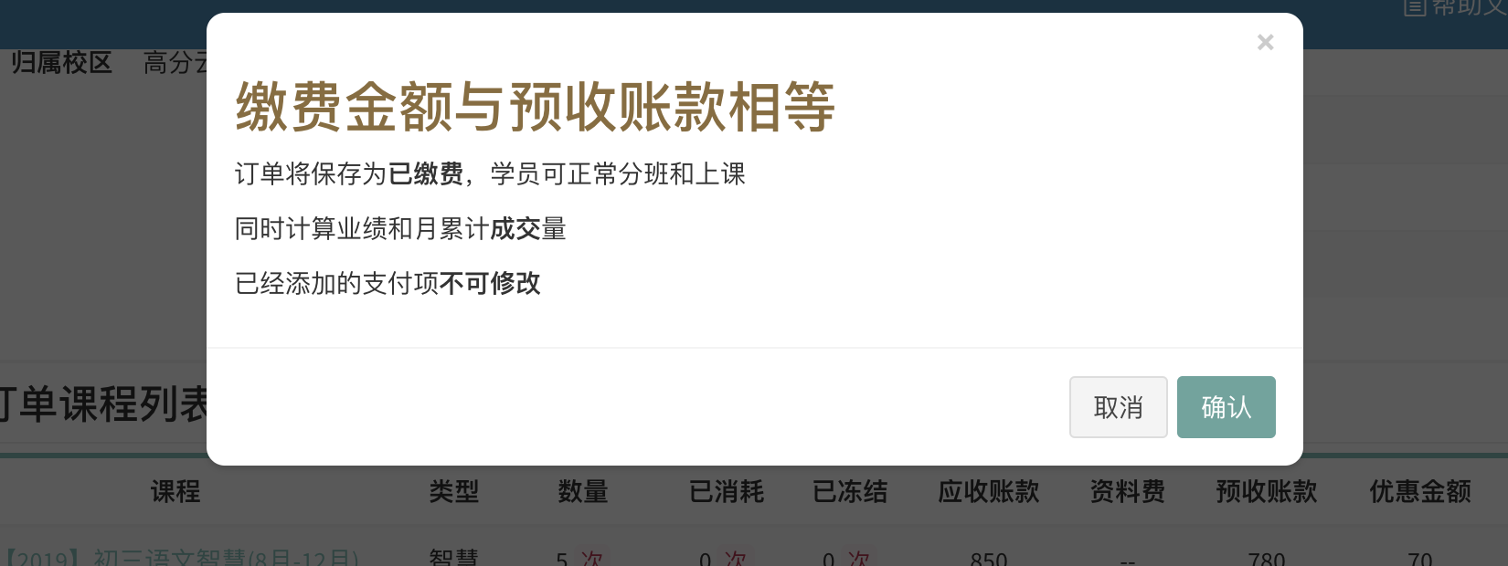 订单缴费提交成功,提示当前订单的支付情况,同时会提示业绩计算结果