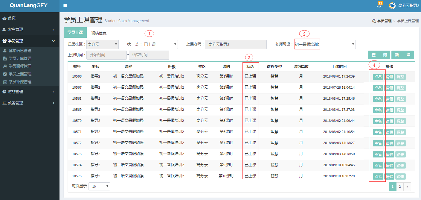① 老师私下约个辅后再到系统里操作学员点名确定该学员已上课。在学员上课--将查询状态选择为“已上课”,查找对应上课的课时,将请假的学员点击置为上课状态,请假将自动撤销,老师再次点名即可,“已上课”的学员状态不会有影响。