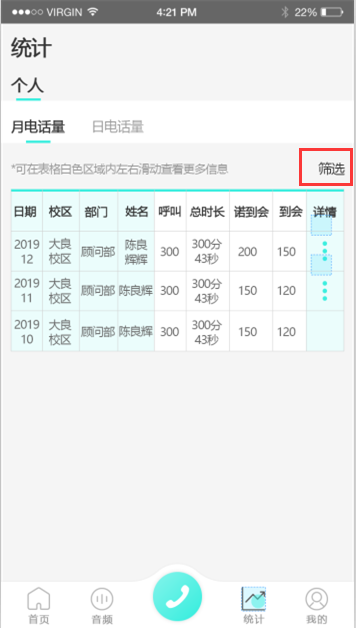 查看老师个人“日电话量”“月电话量”的数据详情和数据分析。