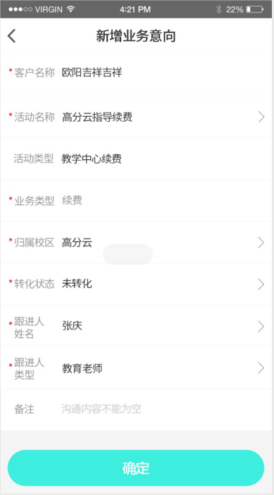 6.跟进人姓名:点击后跳转新页面进行姓名选择。单选
